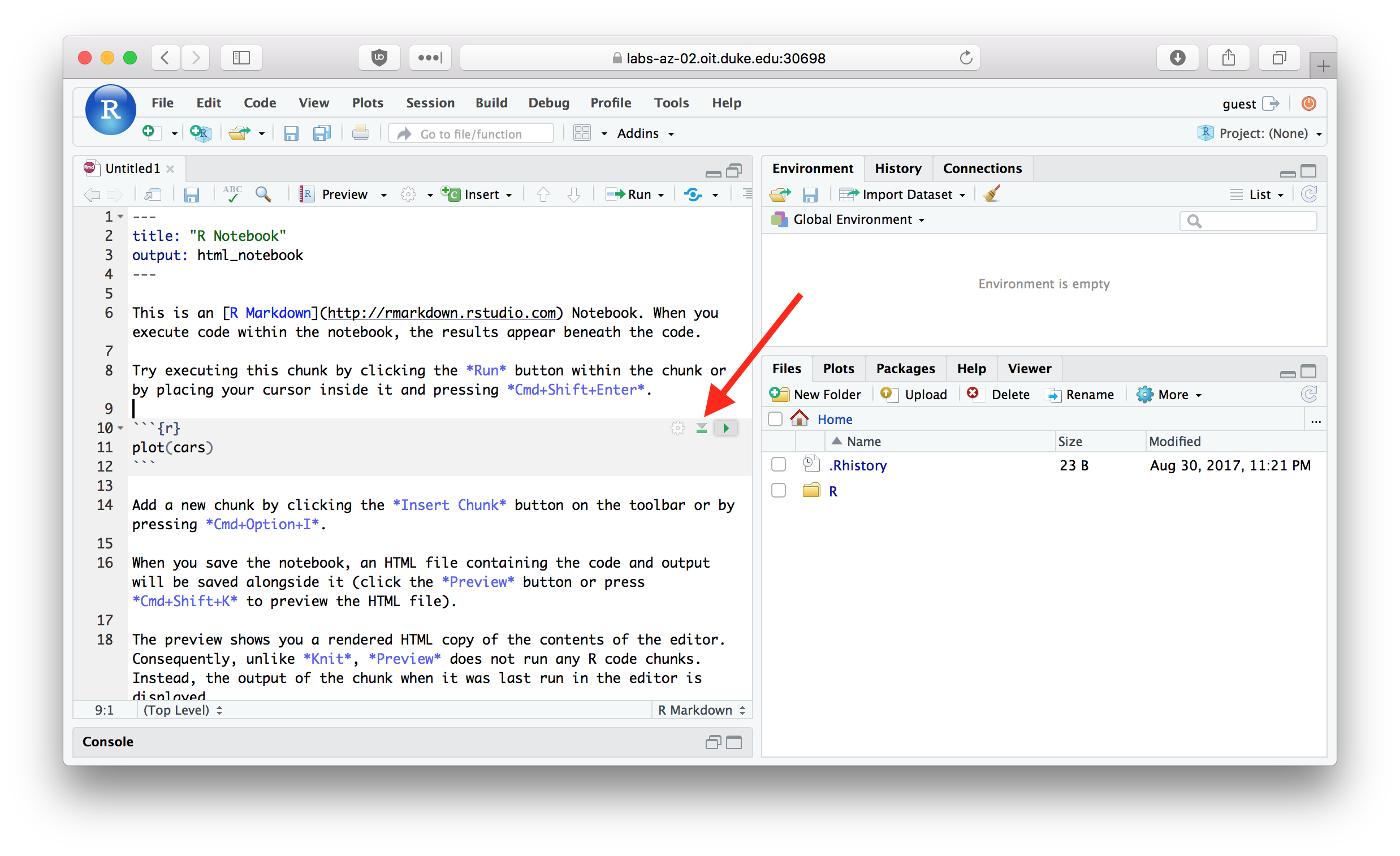 Try running the first code block in the default template now. After the code chunk is executed you should see a plot embedded in your R Notebook as shown below:
