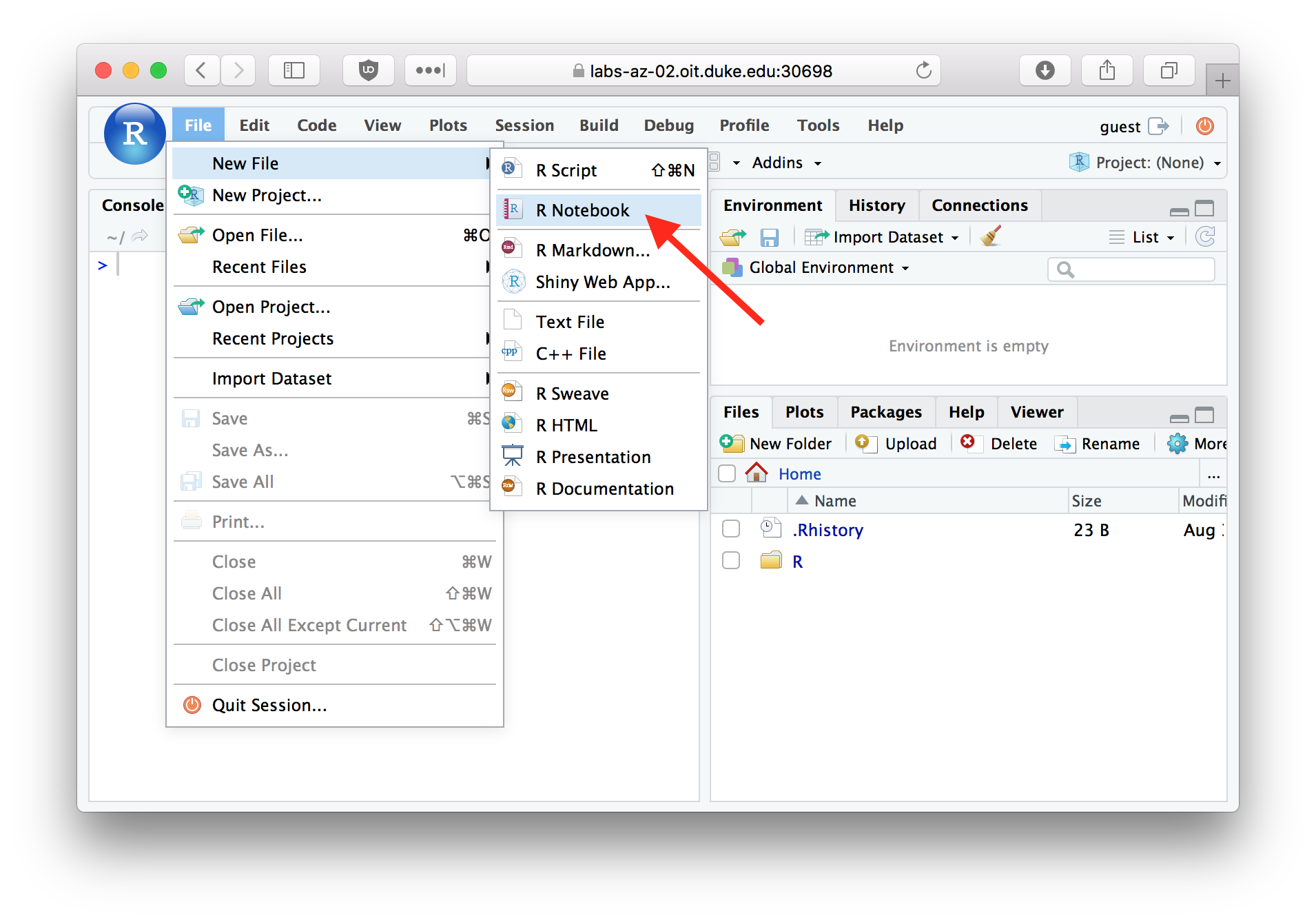 To create an R Notebook select File > New File > R Notebook from the files menu in RStudio.