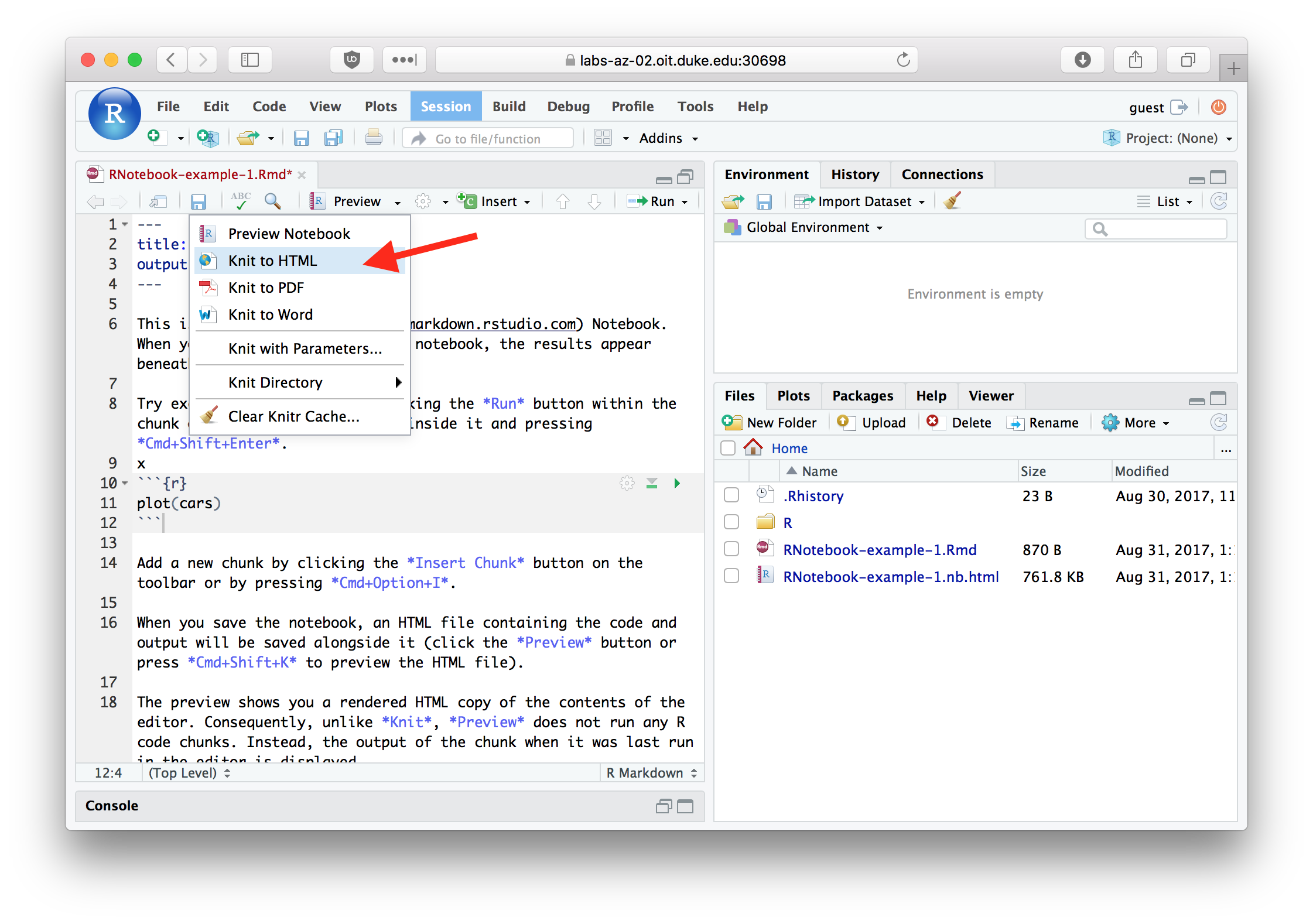 Save your R Notebook as first_rnotebook.Rmd (RStudio will automatically add the .Rmd extension so you don’t need to type it). You can generate an HTML version of your notebook by clicking the “Preview” menu on the Notebook taskbar and then choosing “Knit to HTML” (see image below).